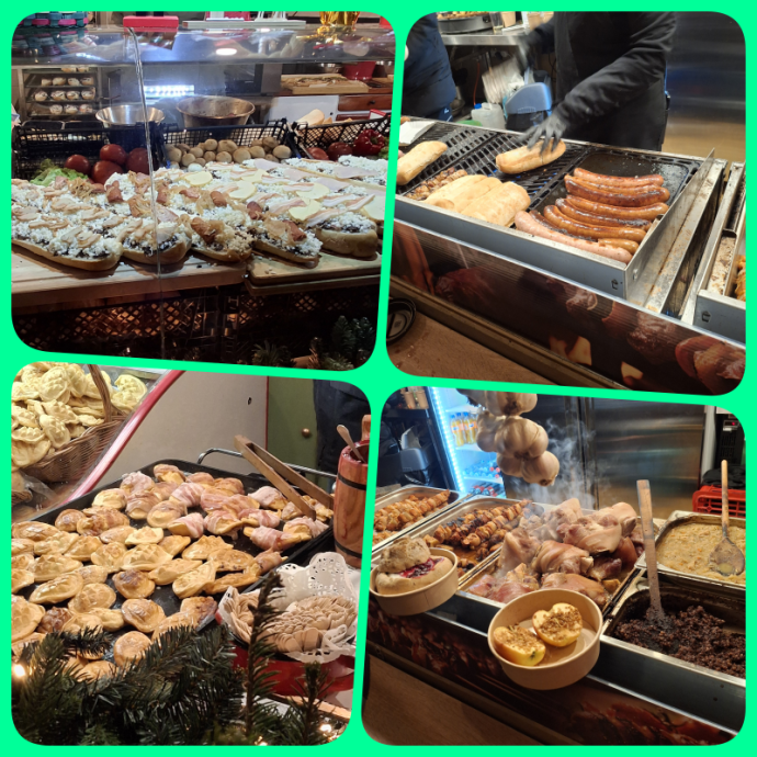 Malam harinya, kami menjelajahi Mały Rynek (Small Market Square). Christmas Market skala kecil tepat di samping Old Town. Di sini hampir semua standnya menjual makanan dan minuman. Ramai sekali, kami kesulitan dapat tempat duduk. Jadinya makan sambil berdiri saja lah. Ada meja2 untuk tempat berdiri sambil makan sih memang di setiap Christmas Market.