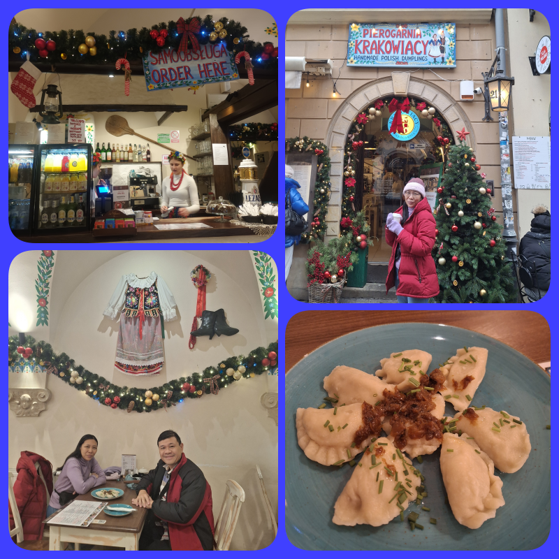Di Krakow ini, makanan khasnya bernama “pierogi”, ini dumpling/pangsit tradisional Poland. Terbuat dari adonan tanpa ragi, berbentuk setengah lingkaran, dan biasanya dimasak dengan cara direbus. Kami memilih resto Pierogarnia Krakowiacy. Restonya kecil dan interiornya didominasi budaya Poland seperti baju, topi, alat musik. Resto ini termasuk yang paling direkomendasikan jika mau mencicipi dumpling di Krakow ini.