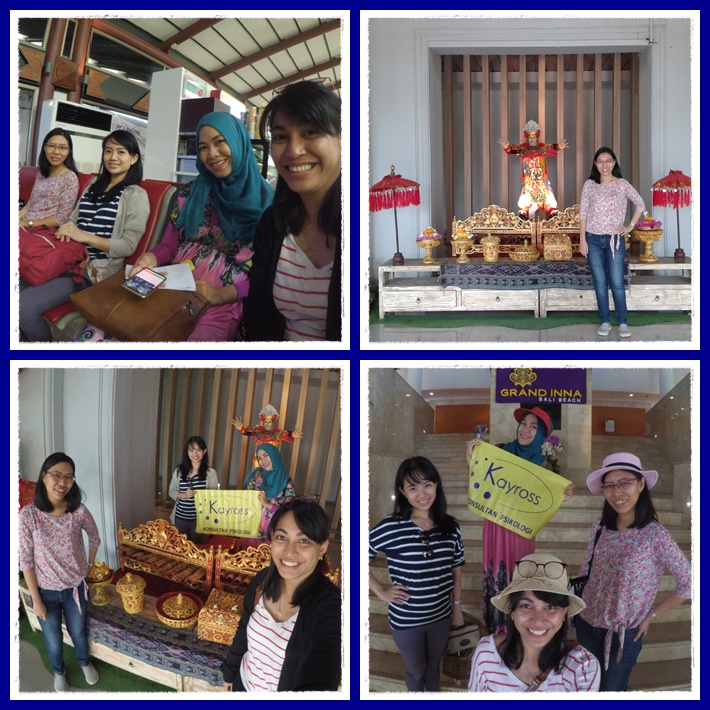 Baru 10 hari Diana pulang ke rumah dari Harbin trip bersama orangtuanya, eeh.. sudah pergi lagi nih ke Bali. Kali ini bersama teman-teman kerjanya, tanpa Jeff lagi. Waduh, bukan bermaksud sengaja nih. Untuk kepergian ke Bali ini, Diana dan 3 rekannya sesama psikolog (Felicia, Luisa dan Tyas) pergi gratis dalam rangka gathering tahunan yang diadakan oleh Kayross Consulting. Psikolog juga manusia yang perlu liburan kan, hehe. Semuanya dibayarin kantor, mulai dari tiket pesawat, akomodasi, makan hingga wisata di Bali. Dikasi uang saku pula. Asyik kan ?! Semua dari kami yang pergi ini sudah berkeluarga loh, jadi kami semua harus meninggalkan suami (dan anak) di Jakarta. Ga papa lah ya, cuma sebentar kok. Biar suami (dan anak) nya mandiri, hehe.
