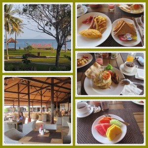 Jam 7 pagi kami menuju restoran untuk sarapan. Cuaca cerah, angin segar sepoi2, pemandangan pun bagus banget, dari restoran bisa lihat gunung krakatau di kejauhan. Baru kami saja nih di restoran, betul2 tidak ada orang. Bahkan petugas restoran pun tidak ada. Padahal untuk teh, kopi dan jus nya semua sudah ready di meja buffet. Sampai akhirnya kami coba telpon ke front office lewat telpon di restoran, barulah 10 menit kemudian ada petugas yang datang.